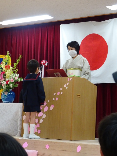 名前を呼ばれて返事をする姿、園長先生と目を合わせて証書を受け取る姿