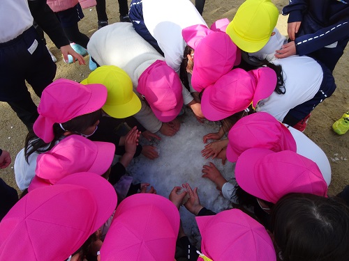 せっかくなので、水たまりの氷をクラスに持ち帰って、みんな氷を持ってハイ、チーズ📷