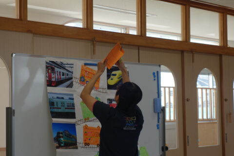 まず初めにひよこ組は黄緑色の電車、うさぎ組はオレンジ色の電車を