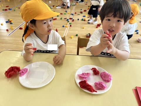 お花紙を丸め、両面テープを貼ったお皿にのせていきます。