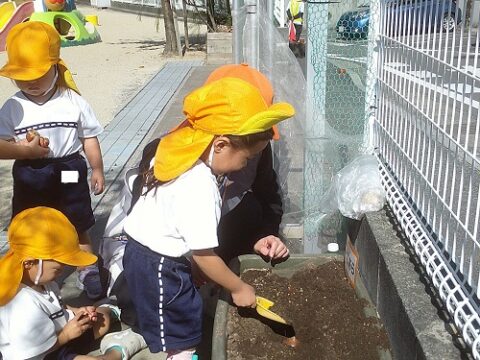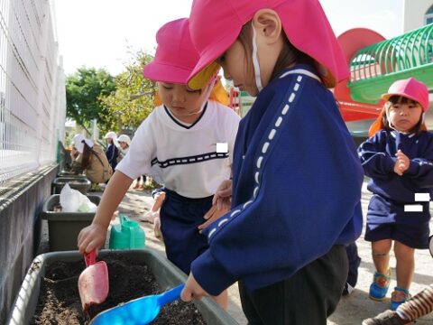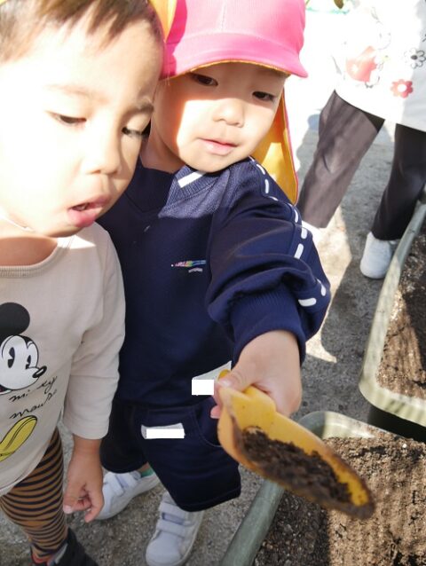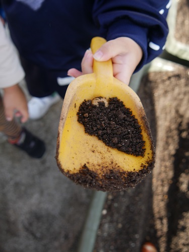 1人1つずつ球根を並べて、優しく土のお布団をかけてあげました🌷