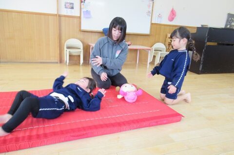 「人形をつぶさない様に、頭と手をしっかり着けて