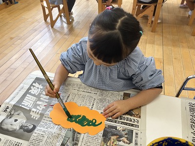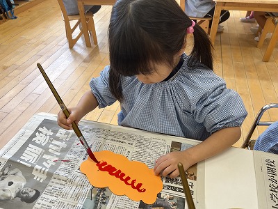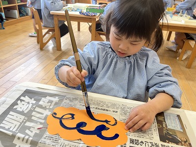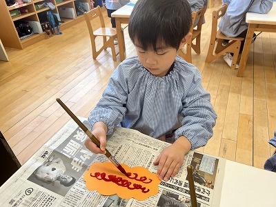 筆を使って鬼の髪の毛を描きましたよ!!