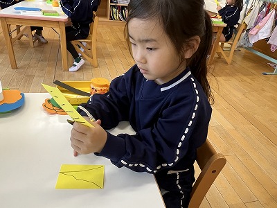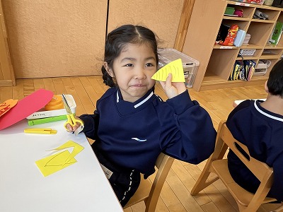 三角を描いて、ハサミでチョキチョキ・・・