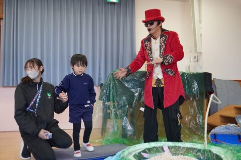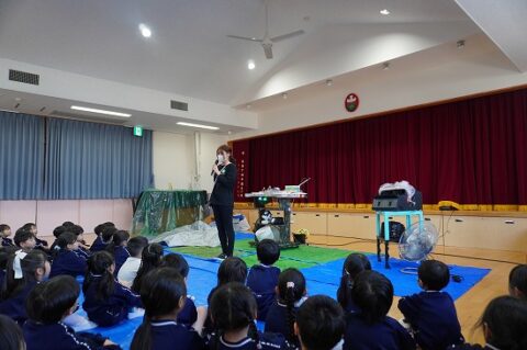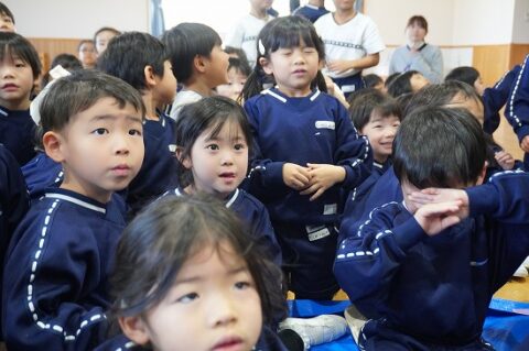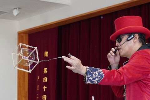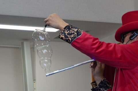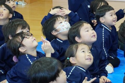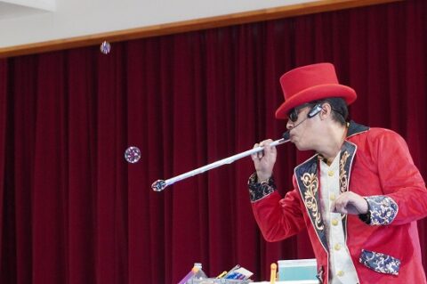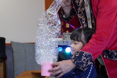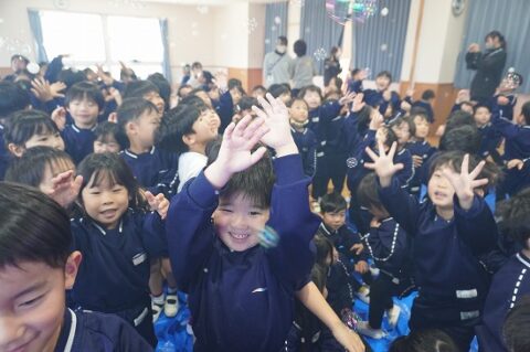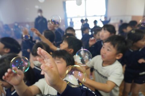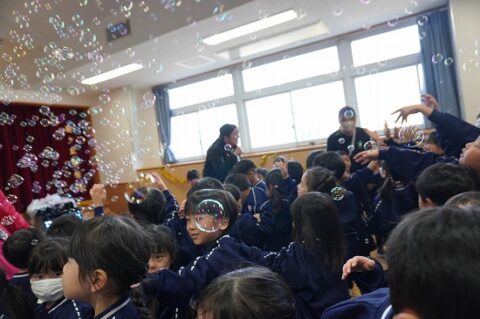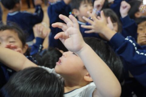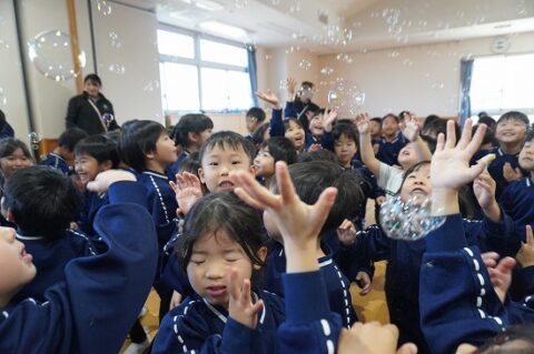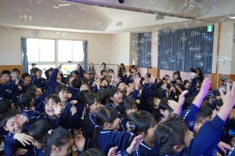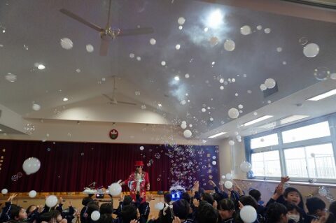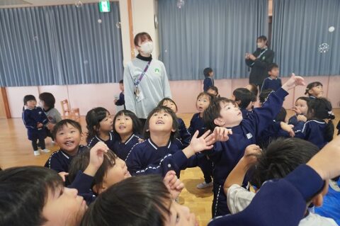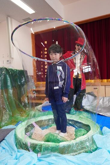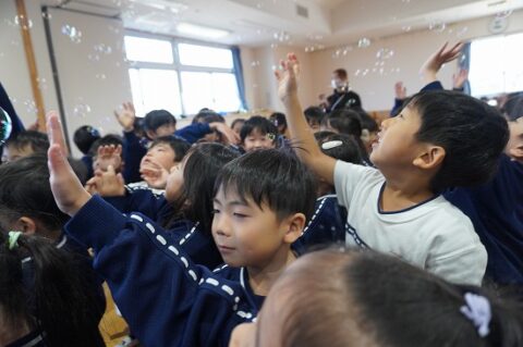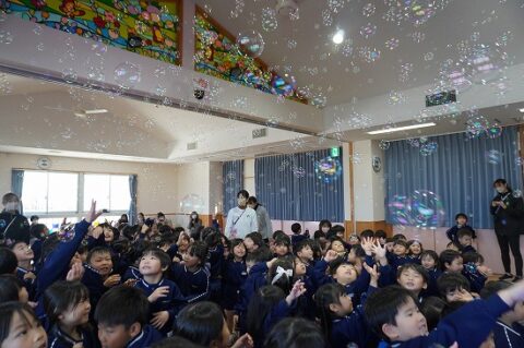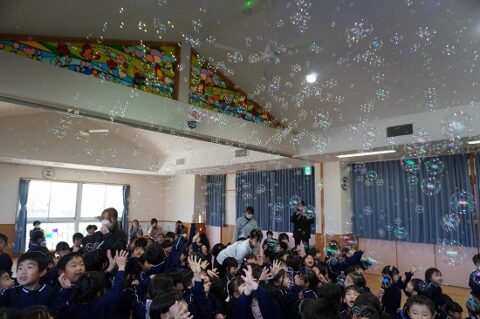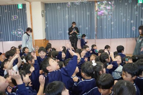しゃぼん玉ショーに釘付けな子ども達