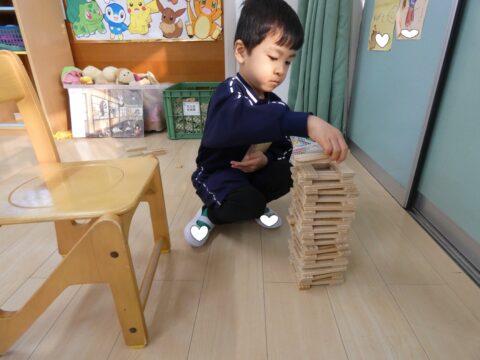 黙々とカラカラ積み木を積み重ねる男の子👦