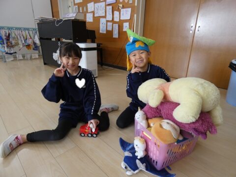 ぬいぐるみをたくさん抱えて遊んでいるお友達!