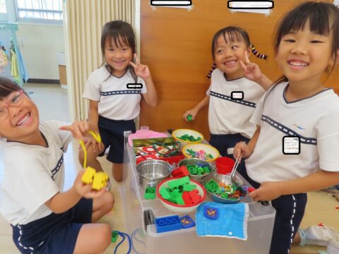 最近、小さいブロックや紐通しを使い、色ごとに分けて