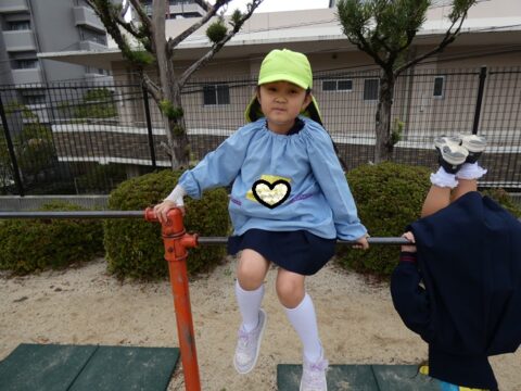 鉄棒の上に乗れるよ~!と得意気な女の子。