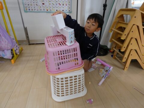 カゴを使って高く積み上げていた男の子