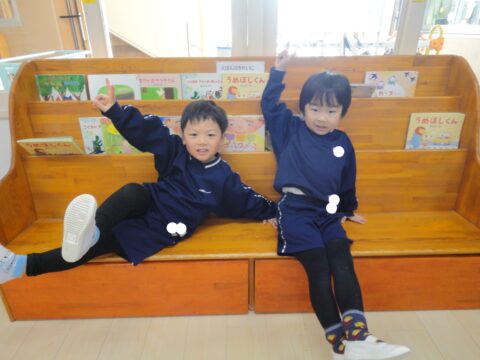 絵本棚のベンチでくつろぐ姿もかわいいです🥰