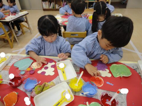 自分達で絵の具をスプーンですくって混ぜ合わせるため、